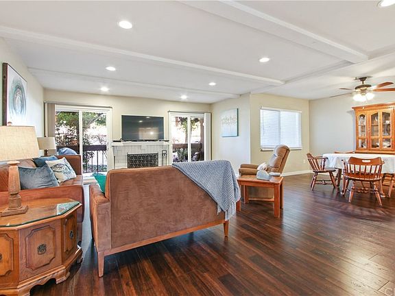 This beautiful spacious & nicely remodeled 2 bed/2 bath single level condo in the gated community of "The Woods". Step inside the foyer and view an open floor plan with wood grain plank style vinyl flooring, beamed ceilings, dual pane windows and sliders and a neutral color palette. The focal point of the living/dining space is a white brick fireplace with mantle. The remodeled kitchen features bright white cabinets topped with grey toned granite and glass tile backsplash. Stainless kenmore appliances include, refrigerator, dishwasher and electric range.There is also an additional under- counter refrigerator,large counter top microwave and a huge walk in pantry/storage closet in the entry. BBQ or birdwatch on the patio just off the living room which overlooks the refreshing community pool.The large master suite can accommodate an office area and has storage galore in the walk-in closet.The secondary bedroom is also a good size and also has a view of the pool and clubhouse. Conveniently located in the center of the hallway is a full bath with shower/tub, linen storage area and washer and dryer (included) with more storage! The detached 2 car garage is a short walk away and the entire complex is gated. Association is conveniently located within walking distance to South Coast Plaza and The Metro Pointe complex of shopping, services ,premium restaurants, theaters , and minutes to the beach. This is a great place to live !
