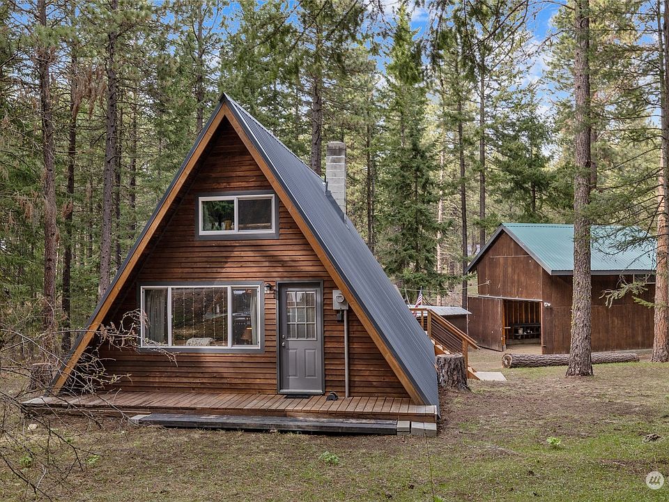 Come unwind in Sky Meadows! This endearing Aframe + shop rests on 1.29 FLAT treed acres. The cabin has an open greatroom space complete with full kitchen, island seating, cozy living area, & 3/4 bath. Toasty efficient pellet stove! Upstairs is the 10x30 sleeping loft. New roof, new windows & super beefy large back deck w/rebar railing. Detached shop is 20x30 with a full loft & drive thru doors. Additional outbuildings include wood shed & warming hut. Warming hut has an amazing firepit & is the perfect spot to warm up with your buddies after an epic snowmobile ride right from your back door! Ownership includes access to the community pool & clubhouse. Includes snowmobile & sled! **Back on Market- Buyer failed to Close.**