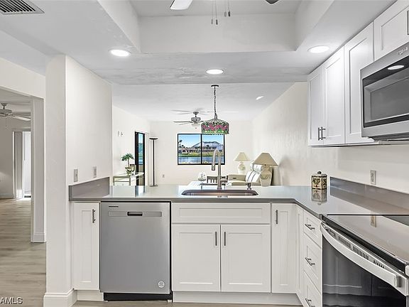 Welcome to Cinnamon Cove, where sun-kissed paradise meets luxurious living. Presenting a stunning & completely updated 1st floor condo, boasting 1 bed & 1.5 baths, this immaculate residence offers the perfect blend of comfort, convenience & coastal charm. As you step inside, you'll be greeted by a bright & inviting living space, adorned with contemporary finishes & an abundance of natural light showcasing vast water views from every room! The open-concept design creates a seamless flow between the living, dining, & kitchen areas, perfect for entertaining. The modern kitchen features quartz countertops, stainless steel appliances, & ample cabinet space. Indulge in the Florida lifestyle on your own private lanai. Sip your morning coffee while basking in the warm sunlight overlooking the lake, or unwind with a refreshing drink as you take in the serene views of the surrounding tropical landscape & gorgeous water. Take a refreshing dip in the community pool, play tennis, pickleball or shuffleboard, enjoy social activities or workout at the clubhouse. Conveniently located in sunny Fort Myers, this condo offers easy access to Sanibel and Fort Myers beaches.