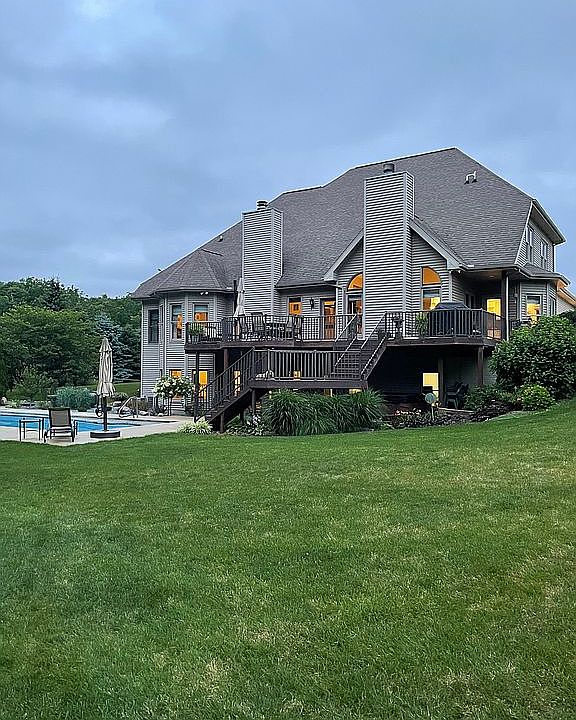 This elegant six-bedroom, five-and-a-half-bath, 5859 finished square-foot home sits at the heart of a secluded 9.61-acre estate just one mile from downtown Middlebury with a five-stall horse barn with water and electricity, six fenced pastures, a 40-tree apple orchard, pear trees, grape arbors, abundant wildlife, and private access to the Pumpkinvine Trail beyond the woods. The main level has been thoroughly updated in recent years, with bamboo and Travertine flooring, Cambria quartz counters, and custom cabinets and drapery. The level includes a conservatory; a formal dining room; a living room with gas log fireplace and access to the upper deck; a kitchen with sitting area, fireplace, breakfast nook, stainless appliances, back stairs, back stairs, and access to an attached three-car garage; a master bedroom with recessed ceiling, large walk-in closet, and bay window; a master bath with tub and large shower; a powder room; and a laundry room with granite counters. Upstairs are three bedrooms, two baths, and a bonus room. Downstairs are a wet bar, a large family room with access to a patio and pool area with hot tub and pergola, a bedroom, a bath, and a guest suite with kitchen, bedroom, bath, and private entry. The house has abundant storage, arched windows, and breathtaking sunrise and sunset views. The 39- by 17-foot saltwater, heated, fiberglass pool, eight feet deep with a diving board, has an automatic cover. The surrounding patio was recently refurbished an expanded. The property includes a concrete driveway and a fenced backyard with irrigation system. Furniture and furnishings are negotiable,