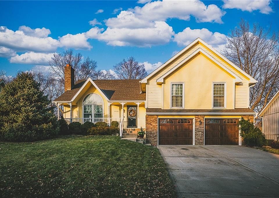 This split-level home for sale was built in the Northland of Kansas City, Missouri, in 1991. The three-bed, three-bath, split-level home features approximately 1,685 square feet of finished space and a front porch sitting area. The home has an open living room with a vaulted ceiling and a brick fireplace with a wood mantel.  The open kitchen features beautiful wood cabinets, laminate countertops, a tiled backsplash, a gorgeous wood island, a corner sink that overlooks the backyard, and a skylight that fills the room with natural light.  The kitchen opens into a dining area with luxury vinyl flooring that overlooks the living room and features sliding door access to the backyard deck.