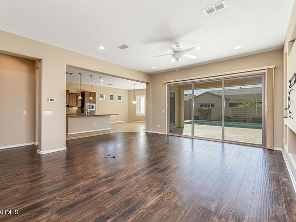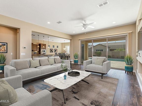 This move-in ready, original-owner home in Bella Via offers 4 bedrooms and 3.5 baths across 3391 SqFt. The floor plan features a spacious great room with a built-in media wall, formal dining, an office with double doors, a bonus/flex room, and a casita with its own entrance from the courtyard. The gourmet kitchen boasts staggered maple cabinets, stainless appliances, granite countertops, tile backsplash, a large pantry, and an island with a breakfast bar and pendant lights. Sliding glass doors in the casual dining area and great room open to a covered patio with an electric shade and travertine pavers around a pool that has a heat pump. The primary bedroom offers backyard access, a tray ceiling with recessed lights, and an en-suite bath with dual vanities, a soaking tub, a separate shower and a walk-in closet. The casita features a living area, bedroom, and full bath. Additional highlights include a large laundry room with cabinets and sink, engineered wood flooring, plantation shutters and ceiling fans throughout, a water softener, a landscape irrigation system, a pavered courtyard, and a 2-car garage. The community provides trails, playgrounds, a dog park, and an amphitheater. Seller is willing to contribute to buyers' closing costs and/or buying down interest rate!
