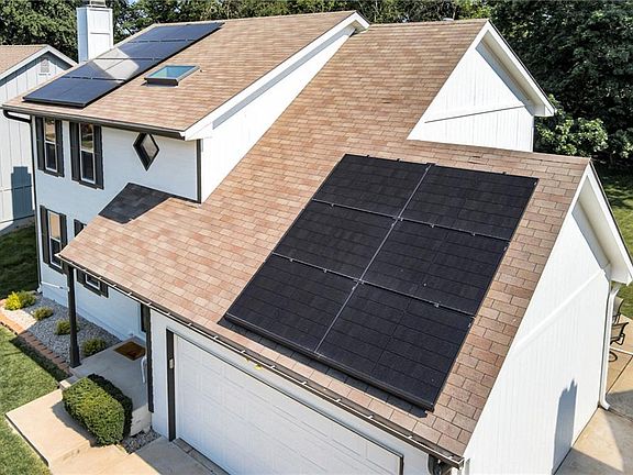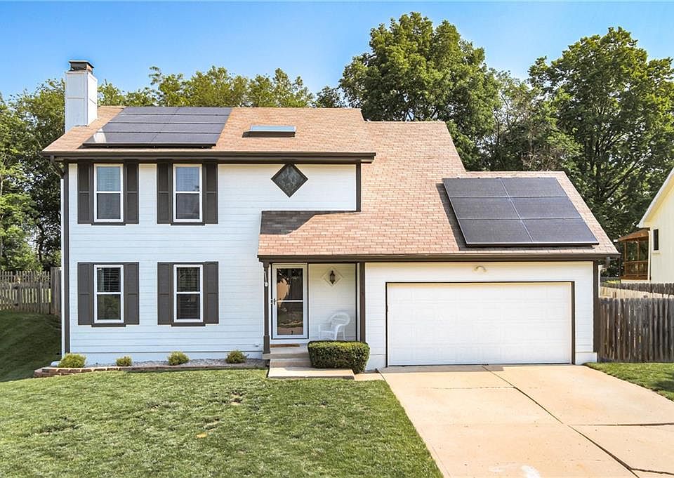 Wow this Home! SO much New! Newly installed, debt-free solar panels! New exterior paint, new interior paint, large windows allowing all the natural light to show off how beautiful this home is. Kitchen has had a full update with quartz countertops, updated backsplash, stainless steel appliances and the cutest little breakfast bar to enjoy a cup of coffee at. Eat in kitchen as well as a designated dining room for all the holidays with family. Laundry on main level in a 2-story home. Large completely finished basement to have the best Kansas City sports watching parties. Upstairs is all four bedrooms with an oversized vaulted ceiling master bedroom with skylight lit master bathroom, double vanities and walk-in closets. Completely private and flat backyard that has a privacy fence and cement pad perfect for a firepit with friends. Walk your pets on the sidewalks of the beautiful Pine Lake subdivision. Staley school district and all the NEW that the Northland has to offer including highway access. Sellers providing Home Warranty.
