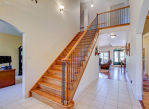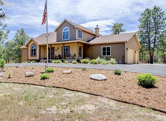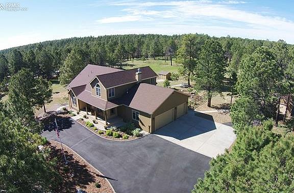 Stunning two-story in Black Forest located on 5 private wooded acres. Home has attached 3-car garage with staircase to basement and detached finished 2-car garage with built-in cabinets and work bench. Entering the home, you?ll find vaulted ceilings, spacious formal dining room to your right and great-sized office with cathedral ceiling to your left. Wood floors/staircase are featured in the entry, dining room, and continue into the kitchen and great room. Gourmet kitchen has granite countertops, huge walk-in pantry center-island, lots of cabinetry, and eating nook with bay windows opening to family room, which has 2-story high ceilings, gas fireplace, and built in book cases/media center. Entire home has large windows to showcase the beautiful setting outside and central vacuum. Off the family room is a huge wood deck surrounded by tranquil forest and fully irrigated landscaping. Main level master bedroom has a large walk-in closet, 5-piece bathroom with double vanity, granite countertops, jetted soaking tub and 2-head shower room. Upstairs are two spacious bedrooms with cathedral ceilings, full bathroom with double vanity and loft with 2 work stations built-in. Walk-out basement offers additional bedroom, full bathroom with double vanity, great rec/family room and fully equipped wet bar/kitchen with granite countertops, stone fireplace, Smartcore Luxury flooring in main areas, carpeted bedroom and tile bathroom. Basement doubles as luxurious in-law suite or private guest quarters. Walk-out opens to a stamped patio with pergola and 6-person Jacuzzi hot tub. Plenty of storage throughout including 600 sq foot utility room. Outside has 10x8 garden shed with electric on cement pad. Enjoy living on acreage in Black Forest while being close to shopping and entertainment.
