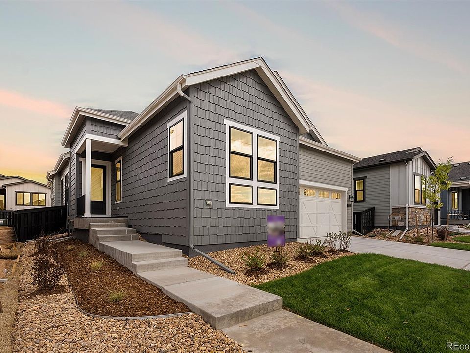 Beautiful one-story home in the desirable Solstice Community. Solstice is surrounded by Chatfield State Park on 3 sides of the community and acreage parcels on the 4th side. This home features 2 bedrooms, 2.5 baths, study with barn door, fireplace with full height tile surround, covered patio, and 2-bay garage. Design finishes include Shaw luxury plank flooring in Truffle, AZT/DT engineered stone stone counter tops in New Venatino Beige and Bianco Pearl, and Yorktowne/Shaw cabinets in White Icing and Smoke. Please contact a community representative for details. The Mirabelle Metropolitan Districts provide various services to the property and in addition to the estimated taxes, a $40 per month operations fee is imposed.