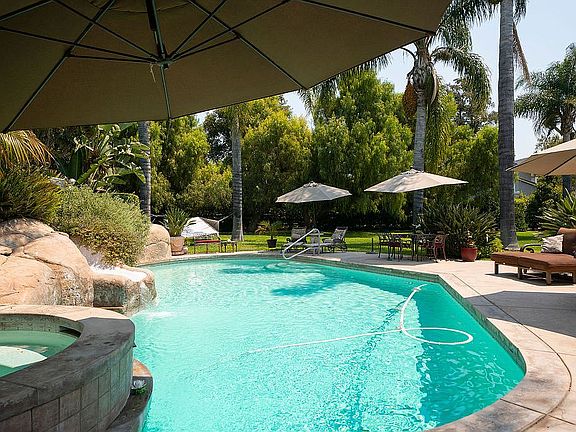 Santa Rosa Valley gorgeous villa located in gated Camelot Estates designed with superb attention to detail and decorated in the most refined manner. Escape to this incredible estate where not a single detail has been overlooked. Sun spills into the interior of the estate where architectural details reminiscent of Monaco, Venice, Tuscany prevail. Gorgeous front exterior with fountain and paved circular drive. Exquisite craftsman features adorn the home's volume, coffered, majestic pillars, classic archways, custom wrought iron staircase and expansive windows. No expense was spared to make this Mediterranean home comfortable without intruding on its elegance. Gracious pillars frame entry to enormous living room with two story ceiling, featuring fireplace, expansive windows with views of rear yard amenities including lighted resort style heated pool with waterfall and rock formed flowing slide. Formal dining room. Spacious Master bedroom with luxurious bath. RV access. Inside laundry room with sink. Separate guest/pool house with living room and bedroom area.