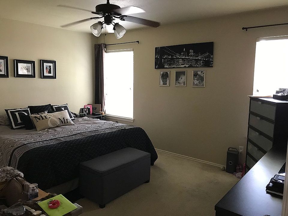 Wonderful 3 bedroom, 2 1/2 bath with a downstairs master and 2 bedrooms and loft upstairs. Primary bedroom has a walk-in closet, dual sinks and a soaking tub with a stand in shower to the left of the tub. Open floor plan with large kitchen. Great yard with mature trees and a covered patio. Nice community park, pool and dog park near by. Available July 21.