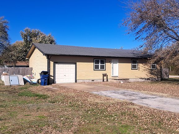This cozy 3 bedroom home is move in ready! Super nice interior with much new flooring throughout most of the house. Primary bedroom has walk in closet. Good sized utility room, attached one car garage. Concrete fiberboard siding, nice double pane windows, attic fan. Comes with a large privacy fenced back yard on a corner lot that is close to the highway for easy access. Plus there is an in ground storm shelter! This one is worth the money! Call Today!