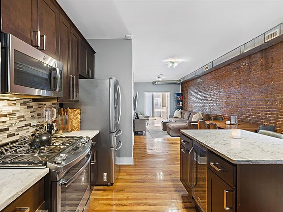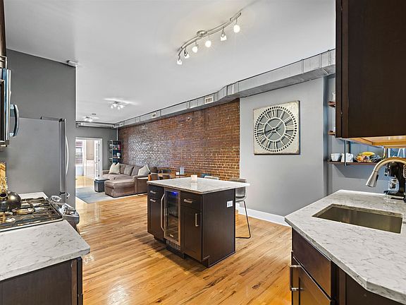 With a setting on one of the most exquisite and charming blocks in all of Hoboken, offering incredible access to neighboring Elysian Park, the Hudson River Waterfront Walkway, New York City transportation and an array of boutique shopping and dining that make the Mile Square City so special, Residence 4L at 1112 Hudson Street is a thoroughly modernized 792 SF two bedroom, one bathroom in a strikingly handsome brownstone dating back to the dawn of the 20th century. The expansive open-concept living, dining and entertaining area is enlivened by white oak flooring, exposed ductwork and brick, as well as a recently updated open chef's kitchen with richly stained shaker millwork, island with bar seating, granite countertops, full suite of stainless steel appliances, and wine refrigerator. The two bedrooms, located on opposing ends of the residence, are the pinnacle of privacy while each are easily accessible to a welcoming bathroom fitted with a glass-enclosed walk-in shower and crisp vanity. Life at home is enhanced by central air conditioning and heat, 27" in-residence LG Sensor Dry washer/dryer, oversized custom California Closet system in the primary bedroom, and private, secure in-building storage. Residence 4L is one block to the NJ Transit express bus to New York City and an easy six minute stroll the NY Waterway Ferry at 14th Street. 1112 Hudson Street is a well-maintained, professionally managed ten-residence boutique condominium special for its ideal location in uptown Hoboken. It is half a block to the lushly canopied seating areas, playgrounds, basketball courts and dog run overlooking the Hudson River and New York City afforded by Elysian Park, one block to Washington Street, and easily accessible to the best shopping, restaurants, grocery stores, coffee shops and entertainment in town. Rental garage parking available nearby. 1.5 month security deposit. 1 month broker fee. Available 8/21 or possibly sooner. Pets will be considered on case-by-case basis.