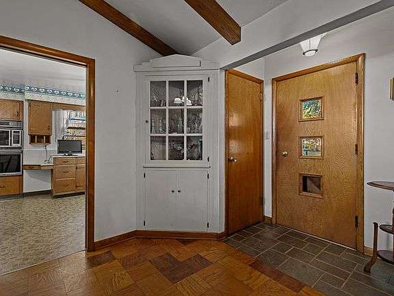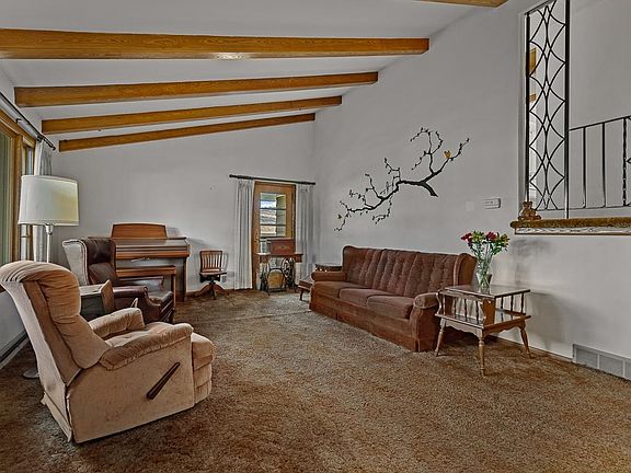 Great retro, light, bright and open multi-level home with contemporary flair! Welcoming covered front porch to slate parquet floored foyer. Expansive 26x14 great room with soaring, beamed, 12' peaked ceiling and carpet covered hardwood floors. Makes a statement! Access to 15x10.6 deck for grilling. 8 stairs with wrought iron railing to 3 nice sized bedrooms. Main bedroom has lots of windows, wall of closets and covered hardwood floors. 2nd bedrooms wall of built-ins surrounded by wall of windows, gorgeous hardwood floors. 3rd bedroom with lots of windows and lovely hardwood floors. Full vintage bath. Great kitchen with chair rail, lots of natural wood cupboards, ample counterspace, pantry, dining area and pocket door. Attached 24x22 garage with access to deck. Lower level family room 29x14 with wall of windows, knotty pine walls, loads of built-in cabinets and bookshelves. Rough-in for bar. Nice laundry room/bath with walkout to back yard. Seeing is Believing!