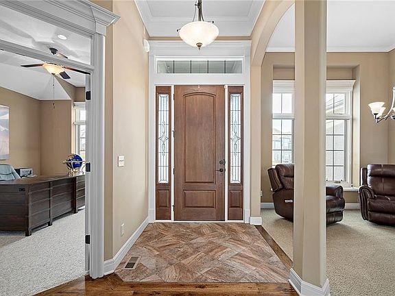 This gorgeous reverse 1.5 story walk-out from C&M Builders, is one of only a few that back up to natural green space offering unprecedented privacy and serenity. Amenities abound in this custom-built home, such as floor-to-ceiling windows (natural light!), stone stacked linear fireplace, natural wood floors, 12’ ceilings. The huge primary bdrm has vaulted ceilings, a green space view, and an access door to the catwalk that connects to the screened-in porch. The screened-in porch comes with an outdoor fireplace, ceiling fan, & built-in tv hook-ups - perfect for the entertainer in your life. The primary bath has heated floors, custom cabinets, a walk-in shower w/ bench, multiple showerheads, upgraded quartz countertops, & a MASSIVE walk-in closet with hidden storage. The main floor also has a 2nd bdrm right off the entrance - perfect for an office, den, or library. The great room includes a modern fireplace & full-length stone accent wall. The kitchen is a culinarian’s dream with granite countertops, oversized island, stained Birch cabinets, w/ glass doors, & accent lighting. Check out that convection oven! PLUS, an instant hot water tap! Stock up with the oversized pantry complete with a quick grocery access door from the garage. One of my personal favorite features! Enjoy all the convenience & space in this 500+ sq ft walkout basement with a recreation/family room that includes a custom bar, and 2 generously sized bdrms. Need a little more room? There is 800+ sq ft of storage space or you can add more bdrms! Don’t miss all that extra storage available under the suspended garage. The ext. of the home has a stucco exterior, remote/Alexis-controlled window treatments. A poured concrete patio under the deck plus a screened-in porch complete this oasis in Raymore. Don’t wait, this beautiful home is priced substantially under what the current owner paid!
