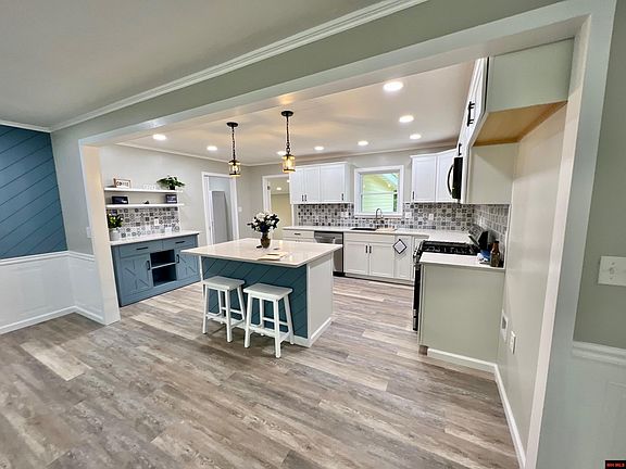 Stunning 3/4 bedroom home with 2 baths move-in ready! This home has been completely remodeled from floor to ceiling. Enjoy the spacious open floor plan with beautiful ship lap accents including coffee bar plus easy to maintain vinyl plank flooring throughout home. The kitchen is spectacular with white cabinets, quartz counter tops, beautiful tile back splash plus eat-in island peninsula. Both baths have been completely updated. Large utility room with nice cabinetry leads to garage. Storage building is 10x20 plus nice grilling patio out back.