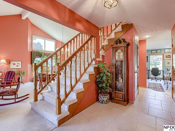 Golf Course property in popular Papillion! Beautiful lot with mature landscaping and plenty of space on the back deck to enjoy the birds and changing seasons. The screened in and lighted Gazebo adds an extra space to host guests and have fun enjoying company outside. This beautiful property has the feeling of warmth and home that most houses just can’t match. Vaulted ceilings, tile entry. Large eat-in kitchen w/ 43 inch tall island, quartz counter tops and prep sink. Lots of cabinets and unique storage spaces make the kitchen functional and comfortable. Spacious family room has brick fireplace, built-in shelving, additional lighting, and large picture windows. Beautifully landscaped w/ raised flowerbeds. Huge 25 x 14 primary suite with sitting area, walk in closet. Large bathroom w/ oversized tub and walk in tile shower, double sinks, and make-up prep area. Bay windows in 2 bedrooms. Gas range and laundry has gas or electric option. Allo Fiberoptic installed subdivision.