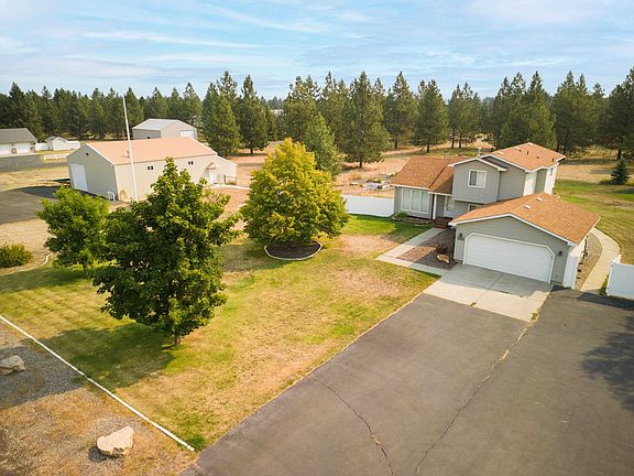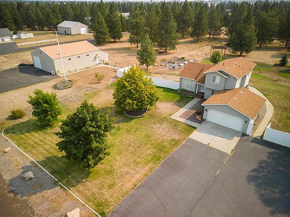 Amazing home on nearly 5 acres with a dream shop and ideal location just minutes to Fairchild and a short commute to downtown Spokane. Cheney Schools! Great 3 bedroom 3 bathroom contemporary home offering nice updates and move in ready. Features include forced air heat, Central AC, gas fireplace, and a 2 car attached garage.The 40x60 shop is ready for work or play or both! Shop is heated, has AC, hot/cold water, and is plumbed for a bath and offers tons of additional paved parking on the shops large paved driveway. Flat usable acreage offering territoral views, new vinyl fenced back yard with sprinklers, raised beds, fenced acreage, power and water extend to the gazebo area near the back of the property. To much to list. This is the one you have been waiting for. Schedule your showing today.