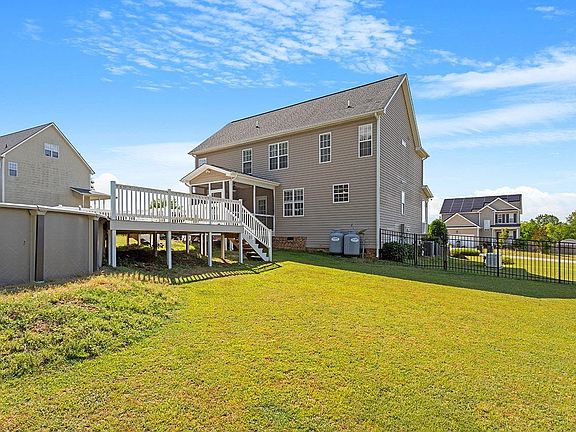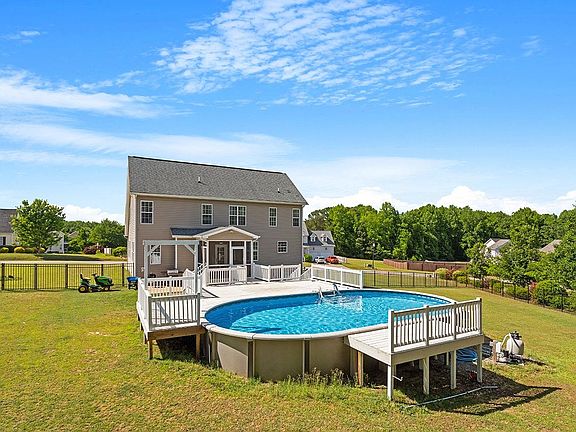 4 BDR 2 1/2 Ba oasis in WAKE COUNTY! 18x33 pool surrounded w/decking, SCI porch, fenced in and no one behind you, perfect for entertaining. Rocking chair front porch, large open concept living with white kitch cabinets. Features quartz ct's, subwy tile backsplash, ss appliances,sep dr, fam rm w /f/p, primary has trey ceiling and double vanity, prvt water closet, soaking tub and sep shwr HUGE closet, new wood floors, new carpet,new whole house generator which turns on instantly .Fenced in backyard with patio, fire pit area. TV Mounts do not convey.
