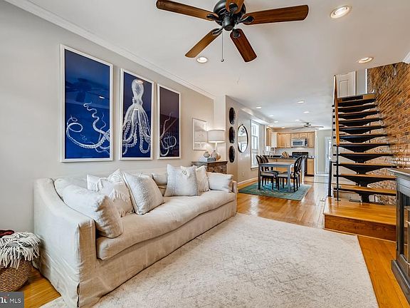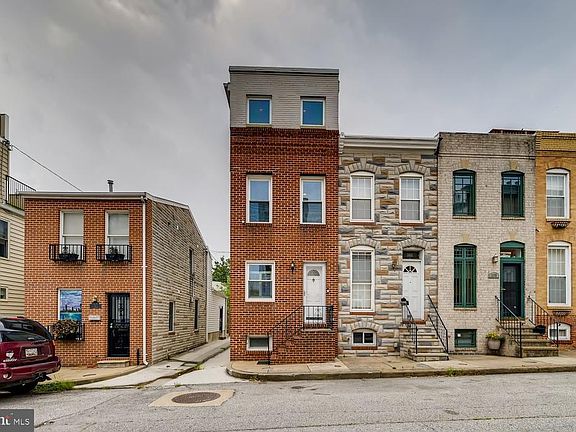 Welcome to this updated, end of group townhome! Situated in a premier location, right off the Canton Square and waterfront, this stunning home boasts a one car parking pad! A two story addition and third level have been added, bringing the total above ground square footage to an estimated 1,700 sq. ft.!! The open concept first floor was designed with the modern buyer in mind. Step into the living room featuring hardwood floors, crown molding, plantation shutters & an abundance of natural light. There is a private dining area located just off the living room showcasing hardwood floors and exposed brick walls. An open, eat-in kitchen also has hardwood floors, as well as granite counters, barstool space & stainless steel appliances! The first level has a half bath! Two true bedrooms on upper level with one bathroom in between. Primary bedroom suite with its own dedicated level in the home! Primary bedroom features a large walk-in closet with stunning city views! Spa-like primary bathroom includes a double vanity w/tons of storage, a large soaking tub w/jets, large stall shower w/dual shower heads & tons of natural light! Take the spiral staircase to the rooftop vinyl deck where you can enjoy a morning coffee or evening cocktail- water views & wet bar included! Framed basement space with a finished half bath and walkout basement steps! Recent updates include LVP flooring on second & third level (2020), storm doors (2020), ALL windows (2019), HVAC top 2 floors (2018), new washer (2018), and all plumbing has been updated to copper piping. Your city oasis awaits you!