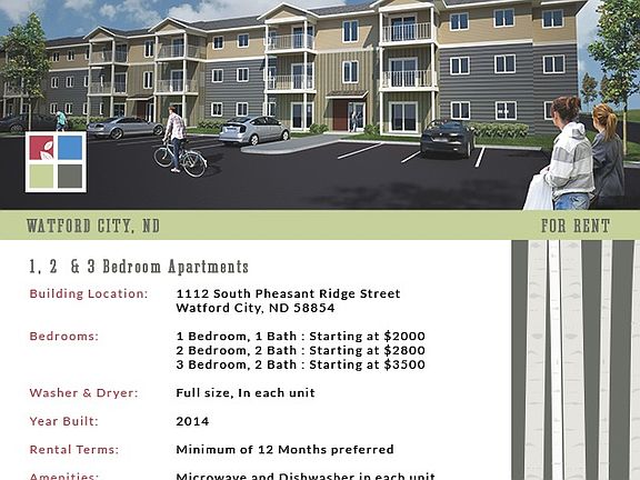 Aspen Heights is a new development of apartments in Watford City, North Dakota which opened November 2014, with a minimum preferred rental term of 12 Months. Location: 1112 South Pheasant Ridge Street, Watford City, ND 58854 844-756-9745 1, 2 and 3 Bedroom Apartments www.watfordaspenheights.com Brand new market-rate apartments In walking distance of downtown Watford City Controlled private access Private deck with each unit Detached garages with electrical outlets to plug into for all apartment units Full size washer and dryer in each unit Microwave and dishwasher in all units Pets allowed: limited to cats & dogs only with an 80lb limit (breed to be approved) Central heating & air conditioning Included utilities: Water, Sewer and Garbage Onsite Property Manager Promotions: 1) One complimentary garage and 2) furnished apartment available. Promotions: For the month of September only! 1 Bedrooms going for $850.00, 2 Bedrooms going for $905.00 and 3 Bedrooms going for $1050.00 for a limited time only! 1) One complimentary garage, 2) Furnished apartment available, Running Referral Program for existing tenants, 3) Job Security, 4) Electric paid by Landlord and 5) Early move in at no charge Running Referral Program for existing tenants. If they refer a new tenant who signs a 6 month lease they get a $100 gift certificate or for a 12 month lease they get a $200 gift certificate. Marketing M2M and flexible lease terms 6,9,12 months.