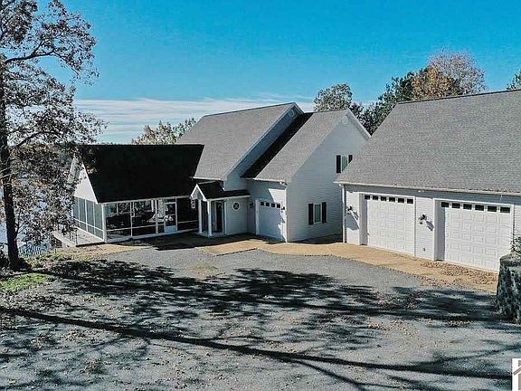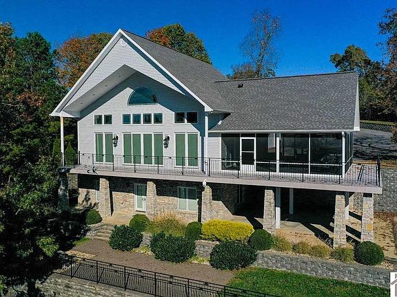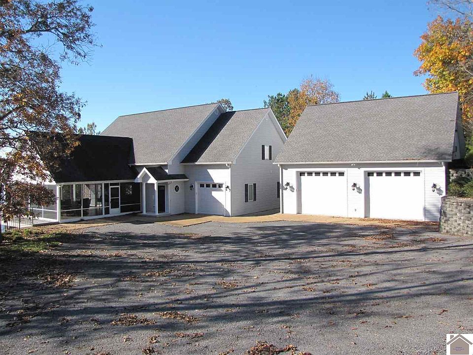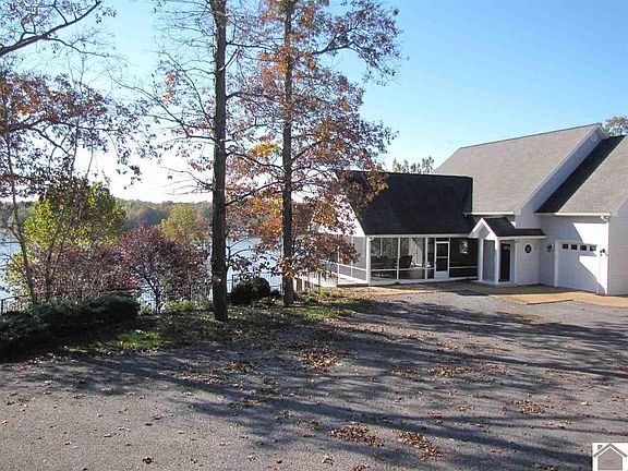 KY LAKE WATERFRONT WITH GREAT VIEW, YEAR ROUND WATER & PRIVATE LOT! Beautiful 5BDR/3BA home located at the end of cul-de-sac. Featuring hardwood floors, open floor plan with beautiful vaulted ceilings. Large screened in porch & wrap around porch. Tankless water heater, 3 high efficiency heating/a/c units. Main level master & bath, 2BDR/1BA upstairs. Fully finished walk out basement with large family room and additional 2BDR/1BA. 1 car attached garage, a 2 car 36 x 36 detached garage with oversized doors, unfinished bonus room (with heat/ac) and a full bath. 2 slip covered boat dock with lift. Paved drive to dock. Oversized driveway for extra parking. Home comes turn-key with all furnishings, home decor, linens, dishes, etc!