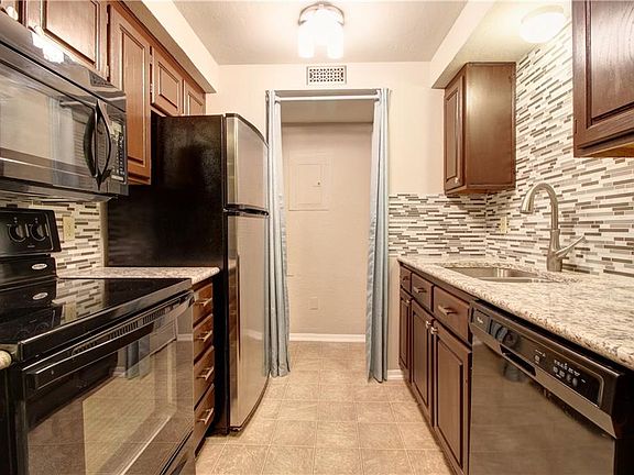 Stratford Place Condos are one of Oklahoma City's best kept secrets. This small community is wonderfully well maintained and has a great homeowner's association. This remodeled single-story ground-floor unit is absolutely move-in ready. Enjoy the comfortable and inviting ambiance, with warm colors, fireplace, stylish light and plumbing fixtures, rich wood plank flooring in the living, and plush carpet in the bedroom. The galley-style kitchen boasts granite counters, tiled backsplash, and updated appliances including microwave oven, dishwasher, refrigerator, and washer & dryer! Constructed to provide for a very solid structure that is both quiet and economical. Monthly dues encompass a gated entrance, water, sewer, trash service, exterior maintenance, lawn care, and building insurance. Simply move in and enjoy a care-free living surrounded by landscaped grounds, mature trees, and two swimming pools!
