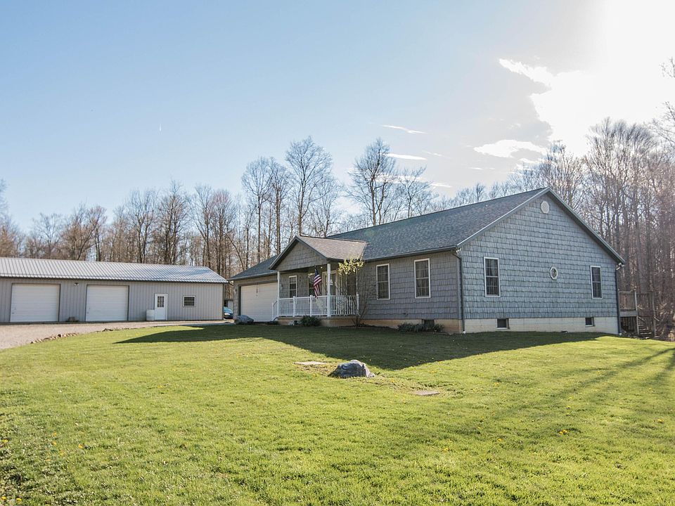 Nature Lovers Delight! 35.25 Acres! Beautiful home featuring 3 bedrooms, 2.5 baths, formal dining room, living room, great room, wonderful cabinet filled kitchen with lots of countertops. Main level laundry, full basement with poured walls, above grade sqft 2568, two heat sources an outside wood stove, and propane. Large back deck, covered front porch, 2 car attached garage. 60x32 pole barn with concrete floor and outlet for a camper. Outbuilding houses the wood stove. The land is almost all wooded with lots of wildlife. This property is very private and sets back off the main road. Close to Granville and Utica.