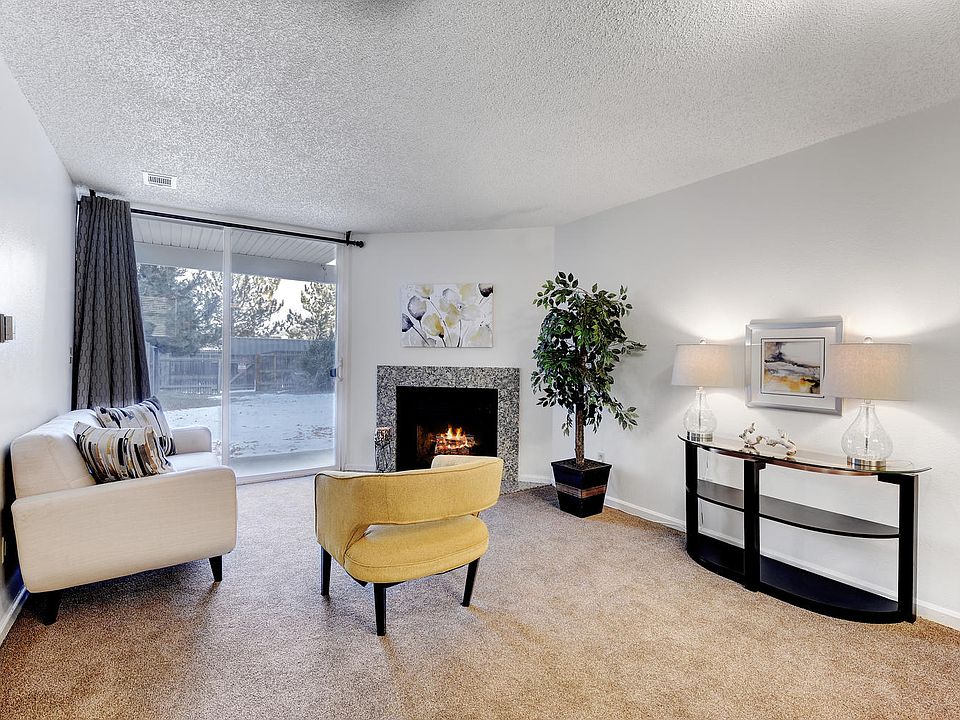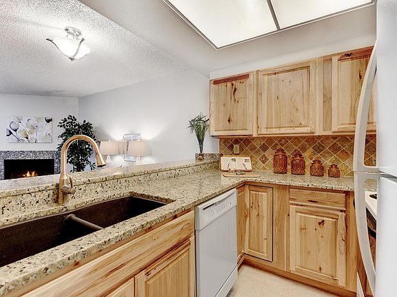 Wonderful one bedroom plus bonus room, one bath, main floor condo! Totally remodeled and updated throughout!!! New hickory cabinets with granite counter tops, breakfast bar that seats 4! Granite fireplace surround, tile backsplash and new tile floors! Ideal layout with living room, dedicated dining room, large bedroom and possible 2nd bedroom or office. The living room with wood burning fireplace walks out to a covered patio and private shared yard. Central A/C, new carpet, new sink, faucet and vanity. The unit is very nicely and tastefully remodeled. Covered and assigned parking space under building. Easy access to shops and restaurants!