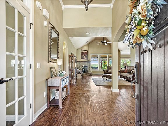 MUST SEE! This charming, immaculate home is located on a half acre lot in the quiet, established neighborhood of Eagle Point. Tucked away, it is conveniently located within minutes of the Creek Turnpike, the NSU BA Campus, top rated schools and the new Sunset Amphitheater Venue under construction. Boasting over 2500 sf of living space downstairs, you are imimediately drawn in by the exquisite hand-scraped hardwood floors and airy entryway adding incredible warmth and character to the layout. To the left is an office or study perfect for remote work and the spacious living room has a corner fireplace with gas logs ready to set a cozy atmosphere. The lovely kitchen with breakfast nook has a granite island with plenty of workspace, storage and a pantry closet ready for the cook of the house. The primary suite welcomes you with its own sitting area, a door leading to the back porch and an ensuite bathroom including a jacuzzi bathtub with separate tile walk-in shower, double vanity sink and large walk-in closets. On the other side of the house you will find a bedroom with its own ful bath and a fabulous laundry room with tile floors, ample space and a sink with a window overlooking the beautiful backyard. Upstairs offers a huge gameroom big enough for a pool table, a game table, a nook with a counter and cabinetry to put a fridge or use as a desk area, another full bed and bath, and the highligh of the space a HOME THEATER!! Complete with a movie screen, theater seating and lighting you can entertain friends and family with feature films or cheer your favorite team to victory! Also off the landing upstairs is a very large walk-out attic with tons of clean, open storage space. The 3 car garage and separate shop allow for all of your tools and landscaping equipment. A new roof waas installd in September 2024, hot water tank with steam expansion on top in 2021, and HVAC that has been cared for meticulously!