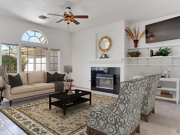 Southwest home close to shopping and schools! Well designed split wing floor plan with approximately 1,807 sq ft, 4 bedrooms, 2 baths, large great room with fireplace, dining area with outdoor access, open to the kitchen with tile counter and natural stone flooring throughout most. Convenient indoor utility with ample storage space and hall cabinetry. Great size master bedroom including dual sinks, sliding door to outdoor spa, separate shower and tub! Perfect amount of space in this approximately 6,098 sq ft lot with little to no upkeep required! Take a look today!