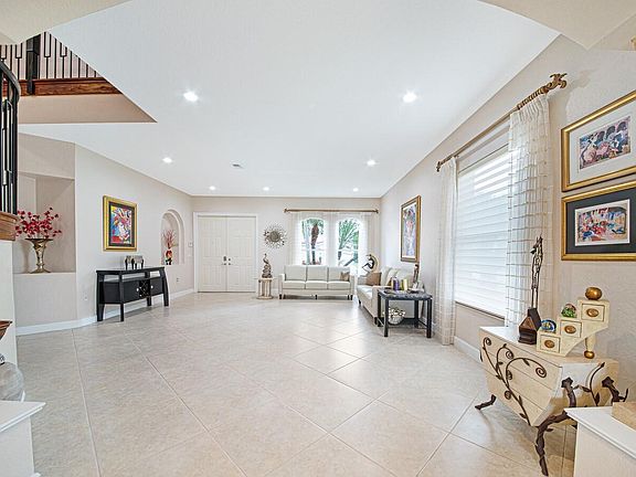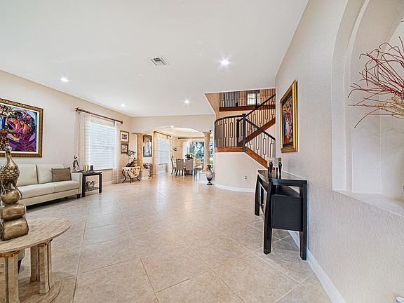 Luxury redefined with this Sterling model home located in Canyon Lakes. This floorplan is ideal for entertaining with a formal living room, formal dining room and a family room with surround sound. The dream kitchen is equipped with granite counter tops, tiled backsplash, double oven, new appliances, under cabinet lighting, center island and a walk-in pantry. The first floor also presents a bedroom-library and a full bath. This home is the pinnacle of luxury with a BRAND NEW 2ND FLOOR A/C, 24-inch porcelain tile flooring, Hunter Douglas Silhouettes, new contemporary light fixtures, engineered wood flooring on the 2nd floor, accordion shutters on the 2nd floor and an abundance of natural light. Take the dramatic iron staircase to the second floor to discover the primary retreat, three additional bedrooms, two with doors to balconies and two full baths.