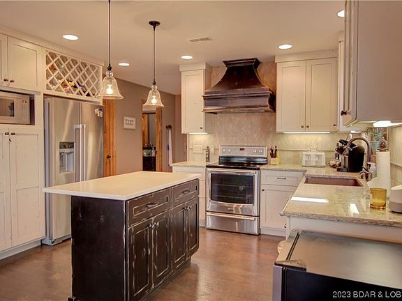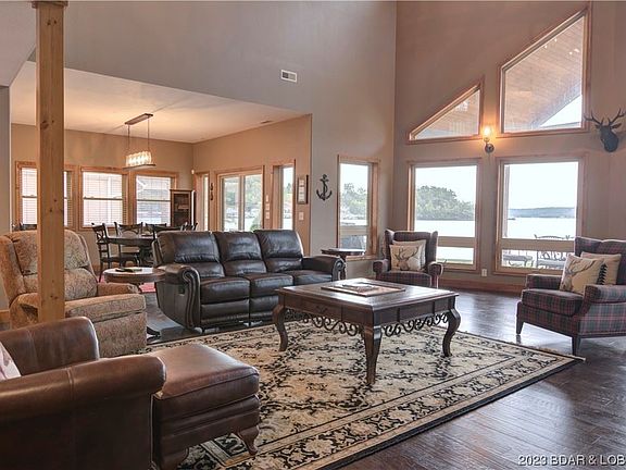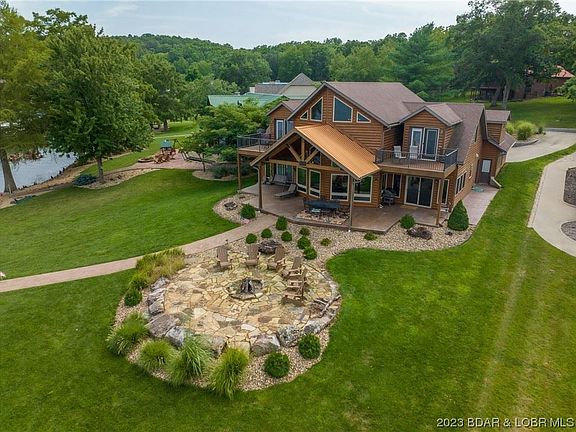 You will not find a better, more gentle lot than this one, especially one in a quality subdivision surrounded by nice homes. Large circle driveway and unbelievably gentle slope from the home to the dock. Beyond that this a point on a large cove with captivating views out towards the Gravois Arm of Lake of the Ozarks. This 2014 quality constructed home has 4 bedrooms and over 3,000 sq ft. As you enter you are greeted with a wonderful great room with soaring ceilings, stone fireplace, and a wall of lakeside windows. Also on main level is a beautiful kitchen, dining area, 1/2 bath & large master suite with soaking tub & walk in shower. Upstairs has 3 bedrooms, (2 with balconys) but also features an open air loft area used as a family room. Outside is simply amazing with a nice patio area, a massive stoned firepit and beautiful lake access. You can walk directly into the lake as if it were a private beach! Home comes completely furnished & includes a beautiful dock with boat/pwc spot.