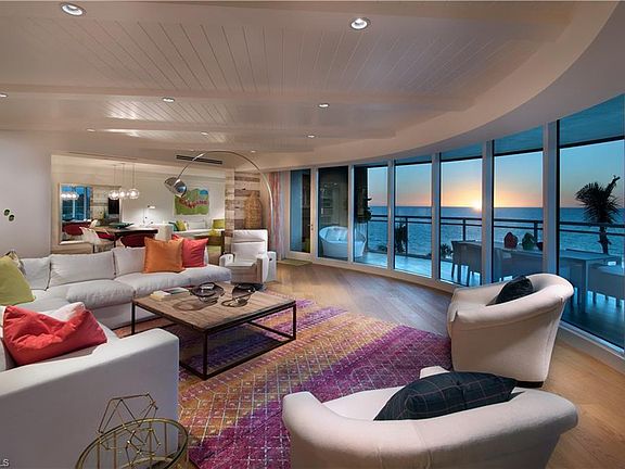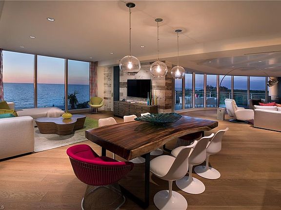 Rarely available "06" unit offers a panoramic view through walls of glass. It is an entertainer's dream in the luxurious award-winning Moraya Bay. This perfect beachfront location sits directly on Vanderbilt Beach, offering an enormous wraparound terrace with unobstructed views of the beach, luxury pool & aqua waters of the Gulf. Designed by esteemed Renee Gaddis Interiors. Private elevator drops you directly into the home through the 200 yr old live edge custom Cypress entry doors. Hardwood floors throughout, Simon Pearce light fixtures and reclaimed wood accent walls show off the space, along with kids custom bunk room. Incredible Views from the "never been used" kitchen complete with Madreperola quartzite waterfall countertops, 2 dishwashers, gas cooktop, dual ovens, 2 refrigerators, large butlers pantry, make entertaining a breeze. Large mstr bath is a spa retreat with dual vanities, 2 water closets, & spa tub. Guests enjoy private access to their own en-suite bedrooms. 24-hour security, onsite concierge with full-service beach club, restaurant, grotto bar make this your home within a five-star pet-friendly resort.