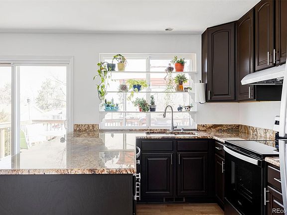 Charming details radiate throughout this Lochwood residence. A serene setting unfolds on a spacious corner lot sprawling w/ old growth trees. Enter into a gracefully flowing layout beaming w/ brightness from large windows w/ custom interior wood shutters. A living area offers space for both relaxing and entertaining. Delight in crafting new recipes in an eat-in kitchen showcasing newer appliances and sleek cabinetry. Retreat to a sizable primary bedroom boasting an en-suite bathroom. Downstairs, a finished walkout basement flaunts a large rec room and an office w/ beamed wood ceilings. Enjoy outdoor relaxation on a large deck boasting views of downtown. Beyond, a private backyard unfurls w/ a sprinkler system, a separate dog run and a firepit area. Upgrades include a newer roof and gutters. Ample storage is discovered in an attached two-car garage. Residents revel in an ideal Green Mountain location close to nature trails, outdoor recreation & more.