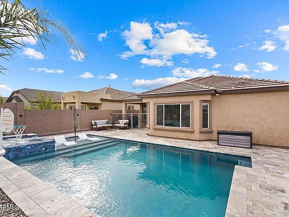 This home has all it all with a BRAND new *HUGE* heated pool/spa w/ travertine, baja step w/ the ambiance of waterfall & colored lights! Located in the sought after neighborhood of Bella Via- just east of the master planned community of Eastmark & Cadence. 4bd + Den/2bath with many upgrades: tile flooring, high ceilings/doors, and recessed lighting. Open concept w/ kitchen that boasts 42'' cabinets, granite countertops, soft close cabinets, stainless Steel appliances, large kitchen island, gas range. Primary bedroom is generous size with a large walk-in closet, double sinks w/a step-in shower. 3 other bedrooms with a full-size bathroom and laundry room.