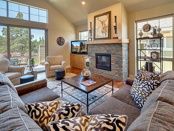 Spectacular Desert Sky home with attached double-car garage in beautiful Eagle Crest Resort! Great room plan features vaulted ceilings, walls of windows, engineered hardwood floors, built-in media cabinets, and a stone gas fireplace. Gourmet kitchen with slab granite counters, breakfast bar, pantry, gas range, and stainless appliances. Master suite on the main level with tiled walk-in shower and dual vanity. Two bedrooms, full bath, and loft on the upper level. Located near the Lakeside Sports Center. Eagle Crest is home to three 18 hole golf courses, three sports centers, pools, courts, a spa and miles of trails.