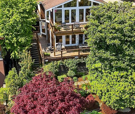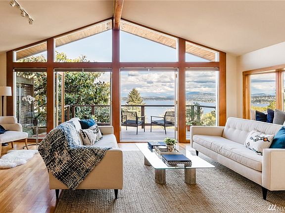 Sparkling views of Lake Washington, the mountains and the Bellevue skyline highlight this private and peaceful home. Beautiful craftsmanship throughout, featuring double pairs of French doors opening to two spacious decks off the main and upper levels - perfect for entertaining and outdoor living. The family room upstairs, awash with light from the wall of windows & vaulted ceilings, provides an expansive vista to trees, lake & sky - an urban oasis. A short walk from shops & cafes of Madrona.