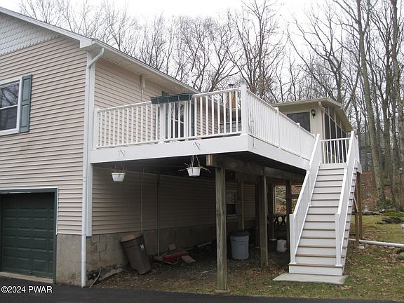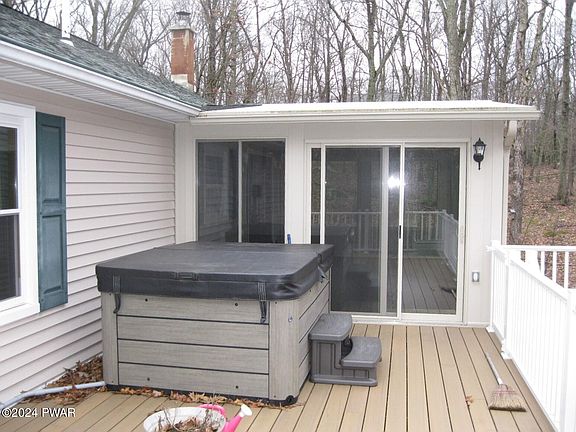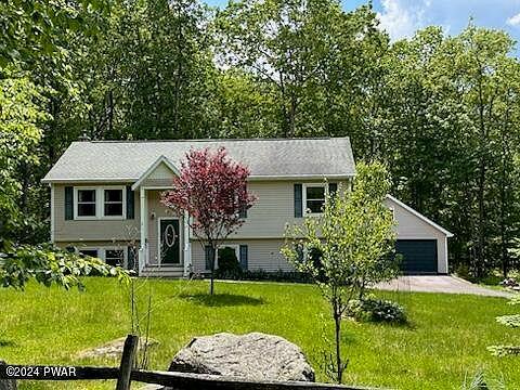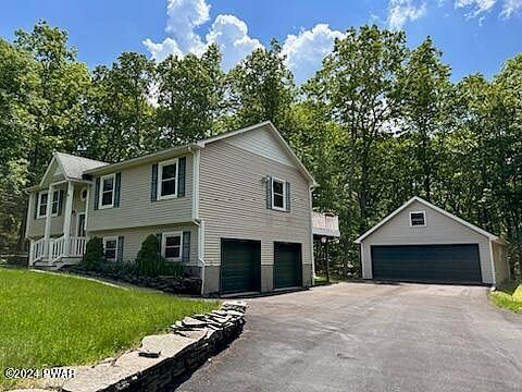 PERFECT POCONO OASIS~ This charming 3 bedroom Bi-Level in exclusive Hidden Lake Estates is well maintained has been updated including kitchen, main living areas main bath and a finished family room in lower level. A large 3-season sunroom adds to the living space and creates the feeling of being in a tree house. A large rear deck for entertaining includes a 3 person hot tub perfect for star watching. The 3.3 acre lot is primarily wooded. Included are a 2 bay integral garage and a large 2 bay detached garage w/full attic, large enough for boats and all the toys. A large storage shed and a raised garden bed is ready for planting. 3 heat sources; electric, baseboard, wood burner and 3 multi splits for heat and air conditioning. Located only 2 miles from Lake Wallenpaupack and near schools.