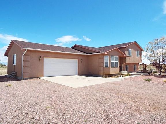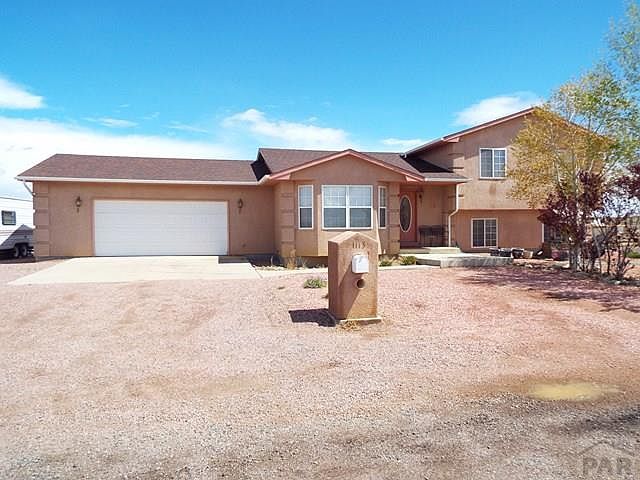 Well-maintained Pueblo West 4BED/3BATH/2CAR tri-level home located on north side (on cul-de-sac) for easy access to I-25. Spacious living room on main level with vaulted ceilings and bay window. Beautiful kitchen with cherry wood cabinets, black appliances and nice pantry. Upper level features 3 spacious bedrooms (including master bedroom), full bath and 3/4 master bath. Lower level includes large family room, 4th bedroom, laundry room and full size bath. Lots of storage/work space in the OVERSIZED 2-Car Garage (672 sqft). Home is on natural gas. Central Air included. A great home situated on a 1.01 acre lot with mountain views.