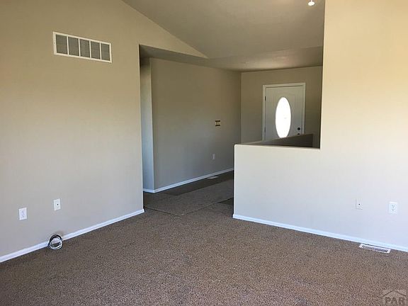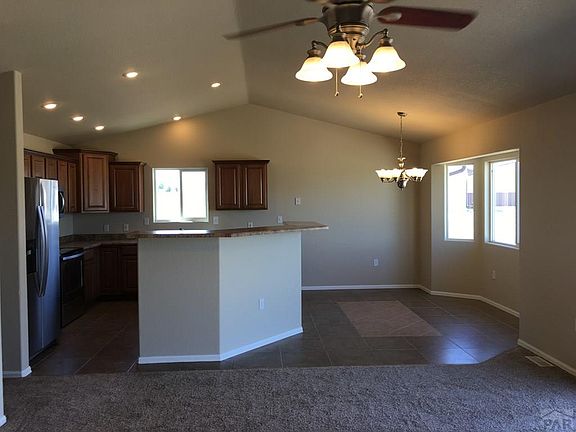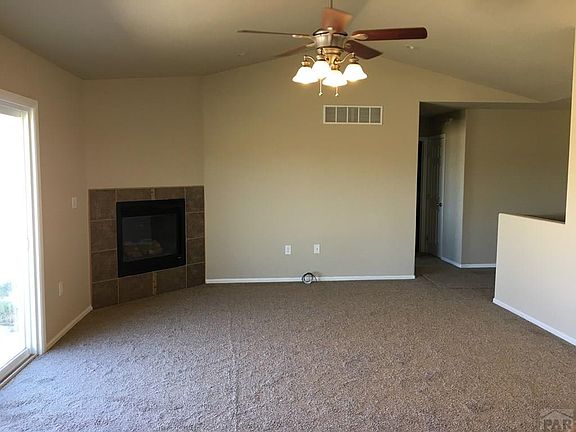 Great location on the North side of Pueblo West. Open spacious floor plan. Living room features vaulted ceiling, ceiling fan, and gas fireplace. Master bedroom with vaulted ceiling and ceiling fan. Master bathroom has double sink vanity, soaking tub, walk-in shower, and large walk-in closet. Two more bedrooms, full bath, and laundry room all on main level. Updated with paint, carpet, and new stainless refrigerator, electric range, and microwave. The open concept is perfect for family entertaining. Unfinished basement. Property sits on acre lot with views to the mountains. Close to I-25. Rv parking. Move in ready! Listing agent is related to seller.