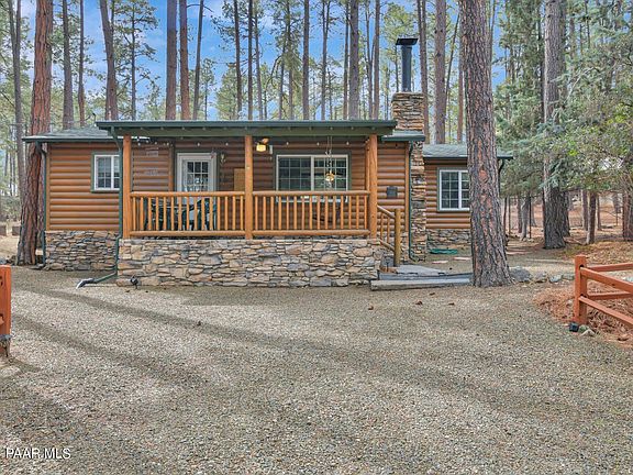 Welcome to your serene retreat at 1113 East Stagecoach Road in Groom Creek! Nestled amidst the tranquil beauty of the Ponderosa Pines, yet astonishingly close to the vibrant heart of downtown Prescott, this adorable log sided cabin offers a perfect blend of rustic comfort and convenient living. With its cozy 785 square feet of living space, this two-bedroom, one-bathroom haven is designed to be your peaceful sanctuary away from the hustle and bustle. The moment you step inside, you'll be greeted by warmth with the comfortable living space complete with a wood-burning fireplace adding an inviting ambiance. A cute country kitchen and larger dining area are perfect for gathering with loved ones. Great outdoor space with a covered front porch and the expansive deck in back offers an ideal