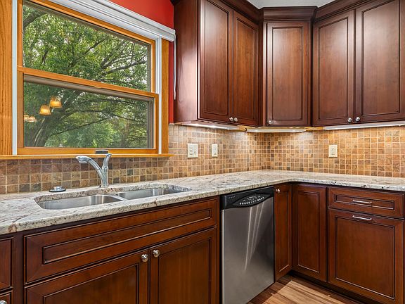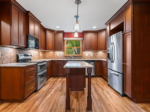 Step inside to discover an inviting main level bathed in natural light, thanks to the oversized windows. The heart of the home, the remodeled kitchen, featuring solid-surface countertops, a center island, brand-new cabinets, and stainless steel appliances with a double oven. The entire main floor was updated in 2021 with beautiful Shaw-Coretec One-Peruvian Walnut LVP flooring, providing a seamless, elegant flow.