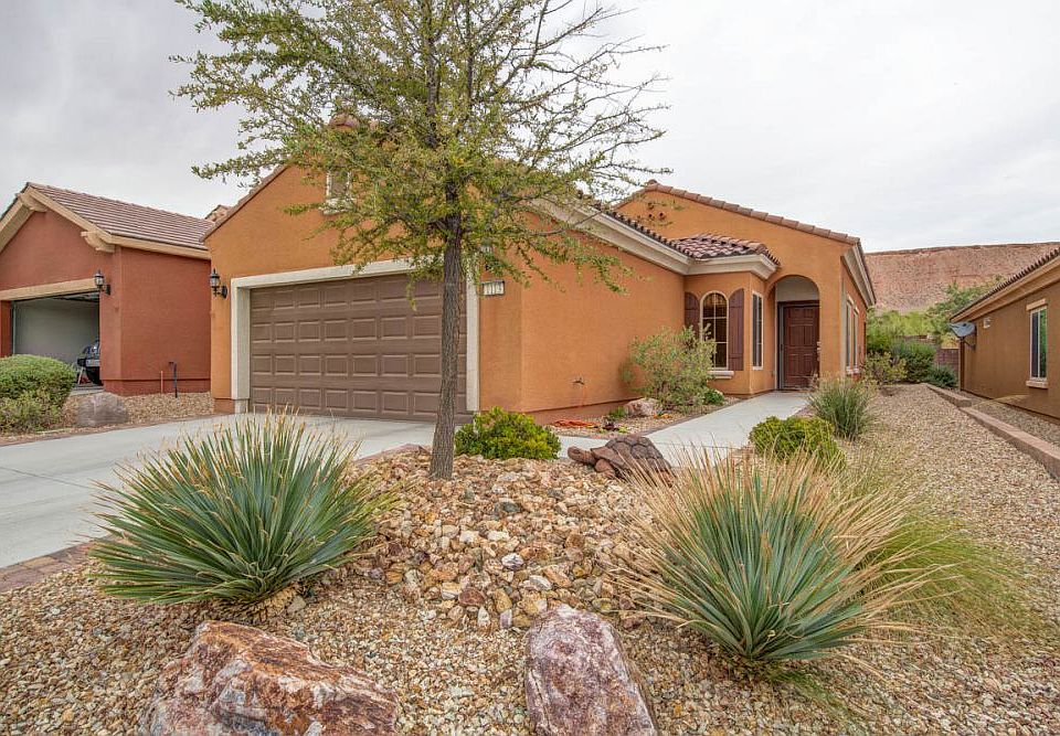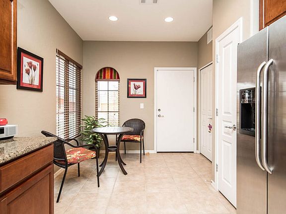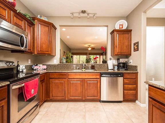 NEW PRICE! SID IS PAID IN FULL on this elegant 2BR, 2BA, plus den Sun City Lilac. It has been gently lived in, part-time, and is absolutely gorgeous. The custom paint highlights beautiful raised panel Merillat Cherry Paprika cabinets. The kitchen cabinets have roll-out shelves. The granite counters in the kitchen area and cultured marble counters in the bathrooms highlight the beauty of the cabinets. All appliances, refrigerator, washer,dryer, and Ecowater filtration/softener, are included. The energy saving tinted windows are covered with custom faux-wood blinds. The home has upgraded lighting fixtures and ceiling fans. There is extended tile in all of the living areas and the carpet is an upgraded Berber. There is storage galore in the garage which has an insulated attic and garage door. The driveway has extended pavers.The mature landscaping, extended cool-touch concrete, & new privacy screen provide a great for you to enjoy the beautiful sunsets. Furniture package available.