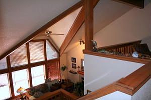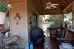 DISTINCTIVE MOUNTAIN CHALET ON THE END OF A CUL DE SAC. 3 BEDROOMS, 3 BATHROOMS, OVERSIZED 2 CAR GARAGE WITH WORK BENCH. FABULOUS ARCHITECTUAL FEATURES, VAULTED CEILINGS WITH WOOD BEAM ACCENTS, LARGE WINDOWS WITH CUSTOM BLINDS, LOFT AREA OFF THE MASTER BEDROOM THAT MAKES FOR A GREAT SITTING AREA OR OFFICE. COVERED AND OPEN DECK TO ENJOY THE VIEWS AND THE WHISPER OF THE PINE TREES. FENCED LANDSCAPED YARD, WITH A GARDEN , PEACH, ELM AND PLUM TREES. TREE COVERED SITTING AREA, WATER FOUNTAIN, ROSE BUSHES AND VIEWS. PRIVATE RETREAT IN A GREAT NEIGHBORHOOD. GREAT ESCAPE OR YEAR ROUND LIVING.