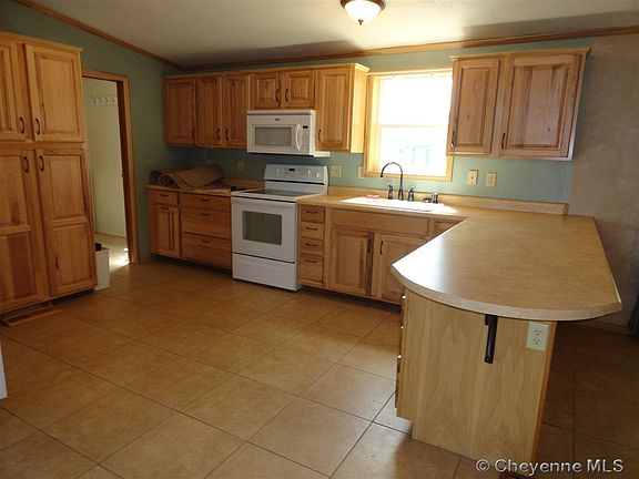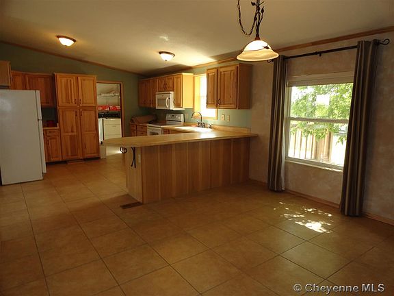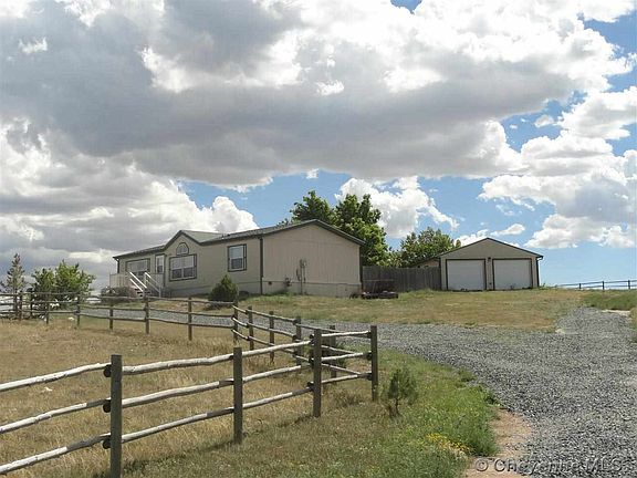 Welcome home to this close in horse property on 2.13 acres. Lovely newer hickory kitchen with large dining room, some new carpet, tile in entry, baths, kitchen and dining room. Panoramic views of foothills and Cheyenne, pole fenced perimeter, horse shelter, privacy fenced backyard, trex deck, detached two car garage, Nice property, close to Cheyenne and Colorado. All appliances included.