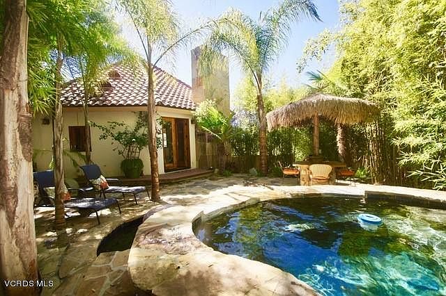 This Oasis is a place where you will want to throw open all the doors and windows, You will get there feeling you are in a exotic location. There is a custom large salt water black bottom spa and cool dipping pool Warm and inviting the inside with its massive flagstone fireplace with a magical Amethyst inlayed for good zen energy. There is one bedroom upstairs with a fluffy double pillow mattress with plush bedding that will make you feel like youre on a soft cloud. There are large 2 bedrooms downstairs. There is also a pull out couch for extra guests. The open-air indoor-outdoor hacienda deck boasts 3 gigantic arching open windows with sweeping mountain views. The kitchen is fully equipped and done in a tumbled travertine as well as the bathroom. This luxurious retreat is completely private and gated. Yet just minutes away from the city, eclectic scenes. This location has its own separate entrance and driveway as well. $5500 a month includes pool and gardener and electric gas and water Amenities 1 King Bed 2 Queen Beds 1 Pull Queens Out Sleeper Sofa 2 Story Topical Pagoda Style Architecture Bathroom with shower and tub Mountain Views Black bottom Salt water Spa with cold dipping pool Fully equipped kitchen 4 Flat Screen TV's HBO WIFI Tropical themed