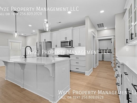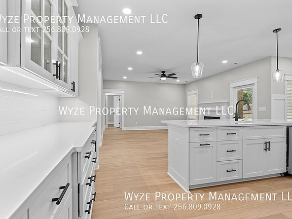 Step into modern elegance with this beautiful recently built brick home, perfectly situated in a lush, tree-filled neighborhood with stunning views of rolling hills. The exterior boasts a n off-white brick facade, a durable gray shingled roof, and a welcoming blue front door framed by manicured landscaping with vibrant shrubs and mature trees. A spacious front yard with manicured grass leads to a curved concrete walkway, while the backyard offers a generous covered patio ideal for outdoor entertaining, complete with ample green space, a storage shed, and privacy fencing amid surrounding greenery. Inside, the open and airy layout features wide-plank light wood-look flooring throughout the main living areas, complemented by soft gray walls, crisp white trim, and recessed lighting for a contemporary feel. The inviting living room centers around a sleek white mantel fireplace with a black insert and marble hearth, enhanced by a black ceiling fan, large windows with blinds for natural light, and French doors opening to the backyard. Multiple bedrooms provide comfort and versatility, each with plush wood flooring, ceiling fans, gray walls, and ample windows overlooking the serene surroundings. The luxurious primary bathroom showcases spa-like finishes, including floor-to-ceiling marble-look tile in the walk-in shower with a frameless glass door, rainfall showerhead, handheld sprayer, built-in niche, and matte black fixtures. A secondary bathroom features classic white subway tile surrounding a bathtub/shower combo, a white shaker-style vanity with quartz countertop, undermount sink, black hardware, and gray tile flooring. The convenient laundry room is equipped with white cabinetry, Whirlpool washer and dryer, and seamless wood flooring. Additional highlights include a well-appointed primary vanity area with double sinks, quartz counters, black faucets, and illuminated sconces. This turnkey property combines timeless charm with modern upgrades, offering a peaceful retreat in a desirable community. Schedule your showing today! Built in 2024 this exceptional 5 Bed / 3 Bath ranch home situated on park like homesite in a highly desirable area! Zoned for Blossomwood Elementary, Huntsville Junior and Huntsville Highschool. Enjoy the central location with easy access to dining and shopping! Upstairs bedroom can be a bonus room as well. Covered back patio, with private backyard. Granite counter-tops, luxury primary bath suite, high ceilings, and many more features. Side-entry garage with storage, and additional driveway parking. Pets are considered on a case by case basis.