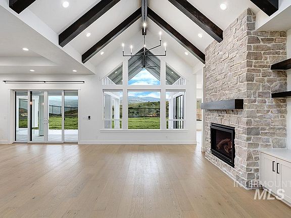 A cinematic North foothills estate, set atop a prime flat ~.43-acre homesite in The Highlands at Cartwright Ranch. This striking Modern Mountain single level design embodies a luxurious approach to quiet Idaho living with sophisticated style and extraordinary mountain views. The elevated setting takes full advantage of the idyllic beauty of the majestic scenery, pulled inwards through a series of large windows. Inspiring beamed cathedral ceilings are matched with angled windows, perfectly framing the landmark lights of Bogus Basin. The interior features an artful contrast of natural warmth and strong lines, crafting an organic modern living experience that mimics the natural surroundings. The open-flowing layout is led by beautiful engineered wood floors, as they seamlessly connect public & private spaces in this desirable split-bedroom design.