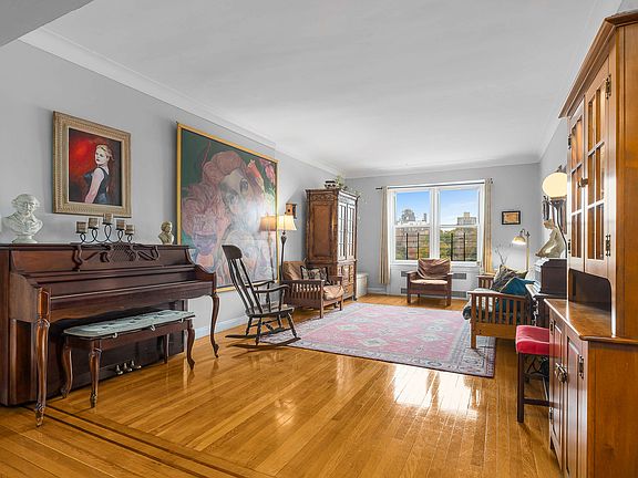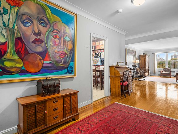 Located on the 6th floor (please note this is not the top floor), the unit opens into a spacious foyer from which all rooms branch off. The foyer boasts a generously sized closet, perfect for an entryway. With its classic built-ins, such as a bookshelf, the foyer exudes charm. The warm parquet flooring adds character throughout the space.