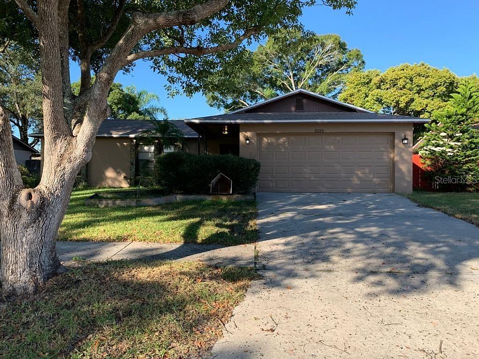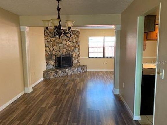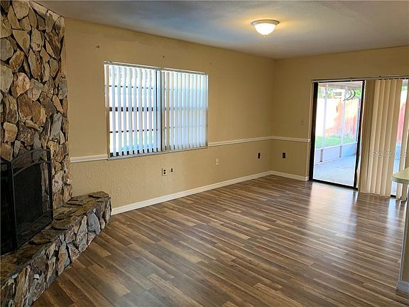 This adorable house features laminate flooring throughout. Split plan has master on one side of house & 2 guest rooms on opposite side. There is a front living room that looks over the mature treed landscaping of the front yard. The kitchen opens up to family room featuring stone wood burning fireplace. The sliders lead out to the screened in lanai that opens on to the large pool & fully fenced yard. There is also a large shed for additional storage. Pool service is included in rent