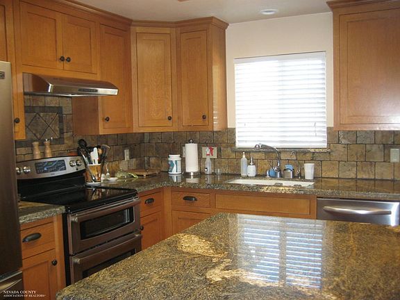 Lovely home in quiet, peaceful area of Rough and Ready. Granite kitchen counters and island with tile backsplash. Very useful kitchen pantry. Acacia hardwood floors in dining room, living room, kitchen and hall. Bamboo hardwood floors in all bedrooms. 900 square foot wraparound deck off the dining area. Central a/c and heat with 5 ceiling fans. Dual pane windows throughout. Spare bedroom is being used as an office, which has an attached bookcase and desk unit that converts to a unique Murphy bed when needed. Master bedroom has bamboo hardwood floors, with large stall shower in the bath. Hall bath has shower over tub. Inside laundry room. Detached 2 car garage has additional 288 square foot room with full electricity, a refrigerator and freezer. Solar has been completely paid off.
