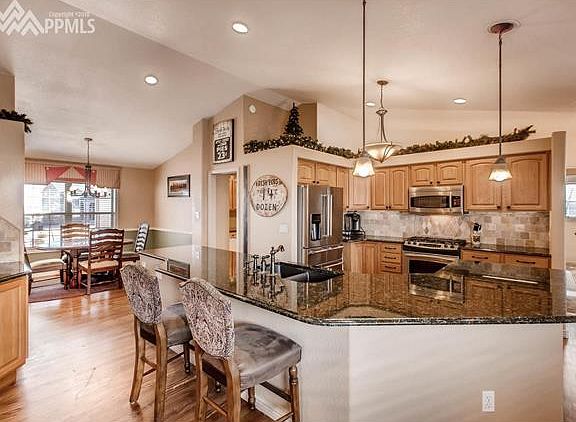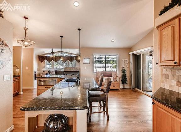 Stunning ranch style home on just over a half acre. This home boasts open concept living, gorgeous formal dining, huge gourmet kitchen w/ eat in area, family room. Enjoy custom features, beautiful hardwood flooring, arched entry ways, vaulted ceilings, granite counter tops and SS appliances. Huge Master w/ spa like 5 piece master bath. Two add'l beds and shared full bath. Basement w/ spacious family room w/ wet bar, office, 2 bedrooms, shared 3/4 bath. Don't miss back yard paradise and 2 car detached garage. This home is a dream. With stunning features both inside and out. Open concept main level living and an entertainers dream. Main level laundry with tons of storage, a sink and located just off the garage. Huge kitchen pantry and walk out to the amazing outdoor space. Basement boasts rec/family room with wet bar and gas fire place, office with French doors, 2 bedrooms and shared 3/4 bath. Step outside to enjoy outdoor living at its finest with a huge private deck, stunning patio, pond, outdoor kitchen with granite counter tops. Fully fenced and landscaped back yard with pond and water feature, green house and garden area. Oversize 3 car garage with heater, plus additional 2 car detached garage. Feel miles away in your own oasis, yet only minutes from the Woodmen Rd and Hwy 24 corridors with an easy commute to Colorado Springs. Close to schools, parks, trails, shopping and entertainment. A Must see!