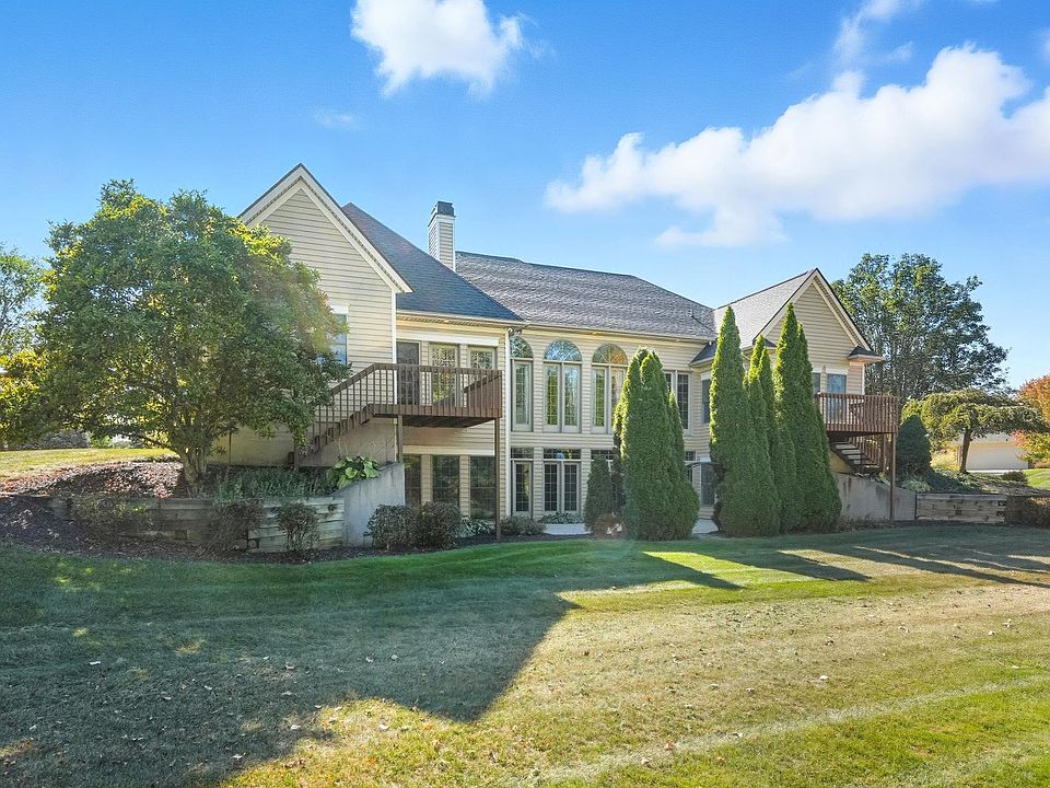 See Virtual Tour below. This beautiful 5218 finished sq ft home features 4 spacious bedrms, 3.5 baths, designed for entertaining & everyday living in mind. Upon entry, this welcoming foyer flows into a formal dining rm, easily accommodating ten guests. Just off the entry is a versatile bedrm that can be an office or den. The formal living rm impresses w/ coffered ceilings, fireplace, built-ins & floor-to-ceiling windows allowing natural light. The kitchen features Corian countertops, custom cabinetry, & opens to a cozy breakfast nook & hearth area. Enjoy serene backyard views from two decks—one off the breakfast nook & another off the main suite—both offering wooded views. On the main level, main suite offers vaulted ceilings, a sitting area, private deck, large walk-in closet, en-suite bath. Two additional main-floor bedrms are connected by a Jack & Jill bath. A guest bath is located just off the dining rm & laundry rm is near the three-car garage. The fully finished walk-out basement features a large family rm w/ 2nd fireplace, wet bar, & game area. You’ll also find a 4th bedrm that opens to a charming four-seasons rm, full bath, & bonus all purpose rm. New Roof within the last 6 years.